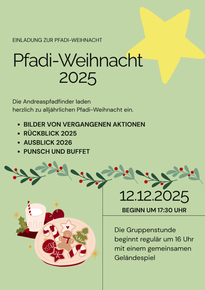 Dazu laden wir euch ganz herzlich zu unserer Pfadi-Weihnacht am Freitag, den 12. Dezember 2025, ein.